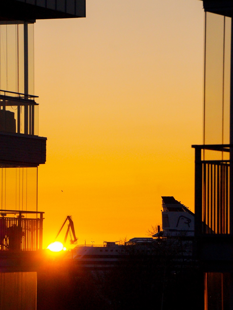 Auringonlasku parvekkeiden välissä.