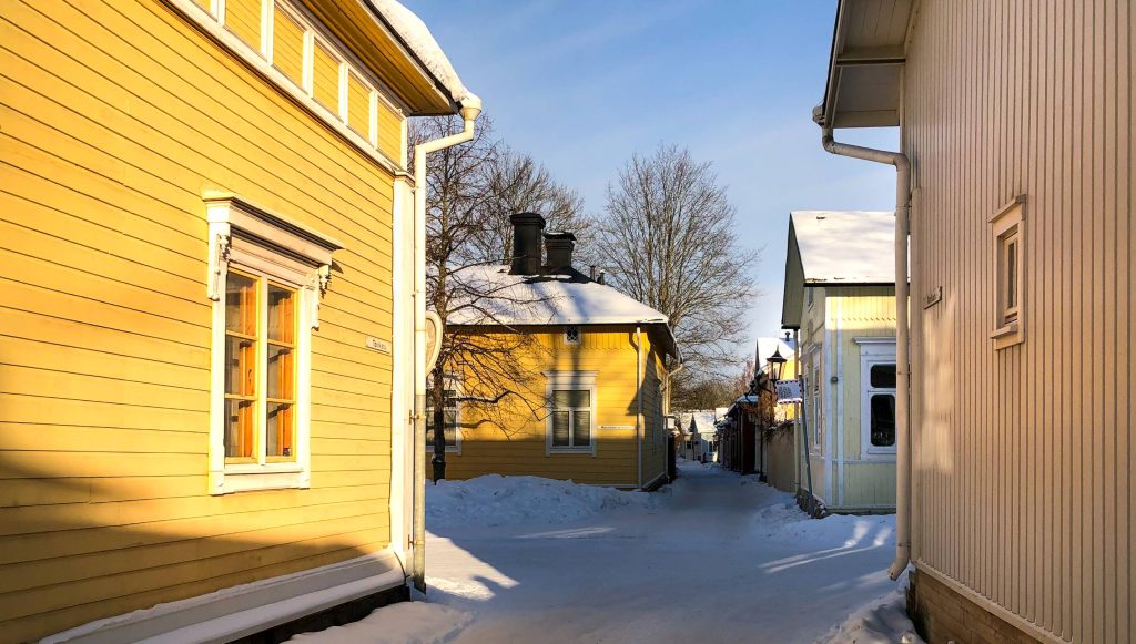Talvinen kuva Vanhankaupungin värikkäistä puutaloista ja niiden välissä kulkevasta kadusta auringon loisteessa.