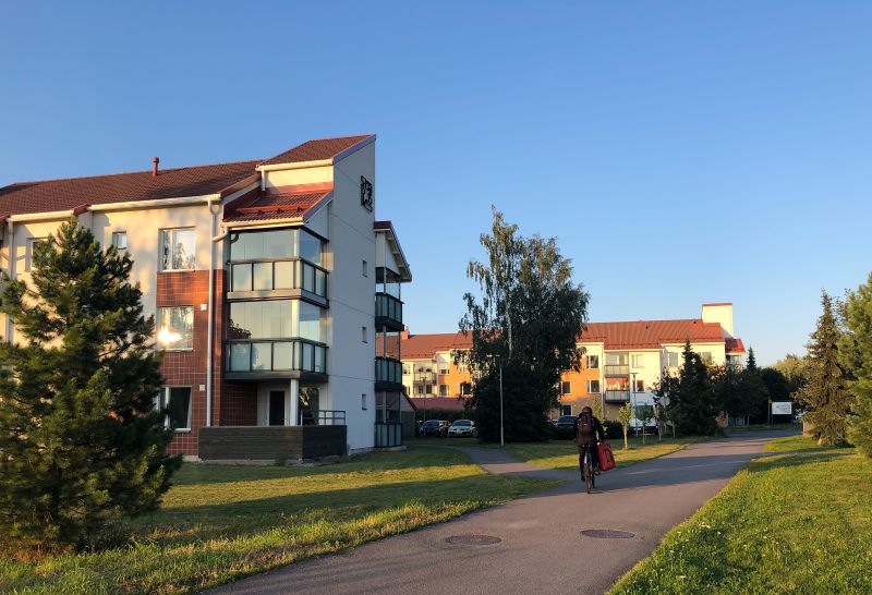 Kesäinen ja aurinkoinen Turun Halisten naapurusto, jossa pyöräilee pyöräilijä.