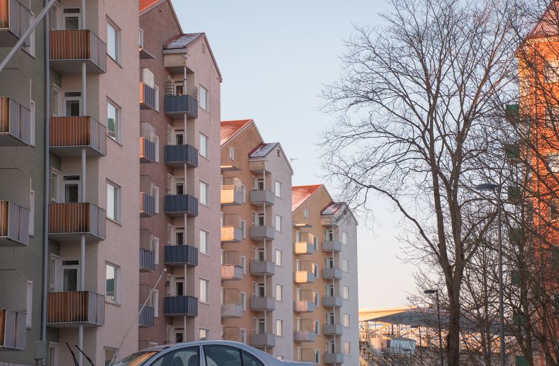 Kuvassa Turun Martin Urheilupuiston kerrostalojen julkisivuja ikkunoineen ja parvekkeineen auringonlaskun aikaan talvella.